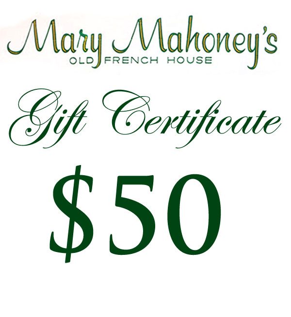 This $50 gift card is redeemable at Mary Mahoney’s Old French House for food or beverages. Not redeemable for cash. No expiration date.